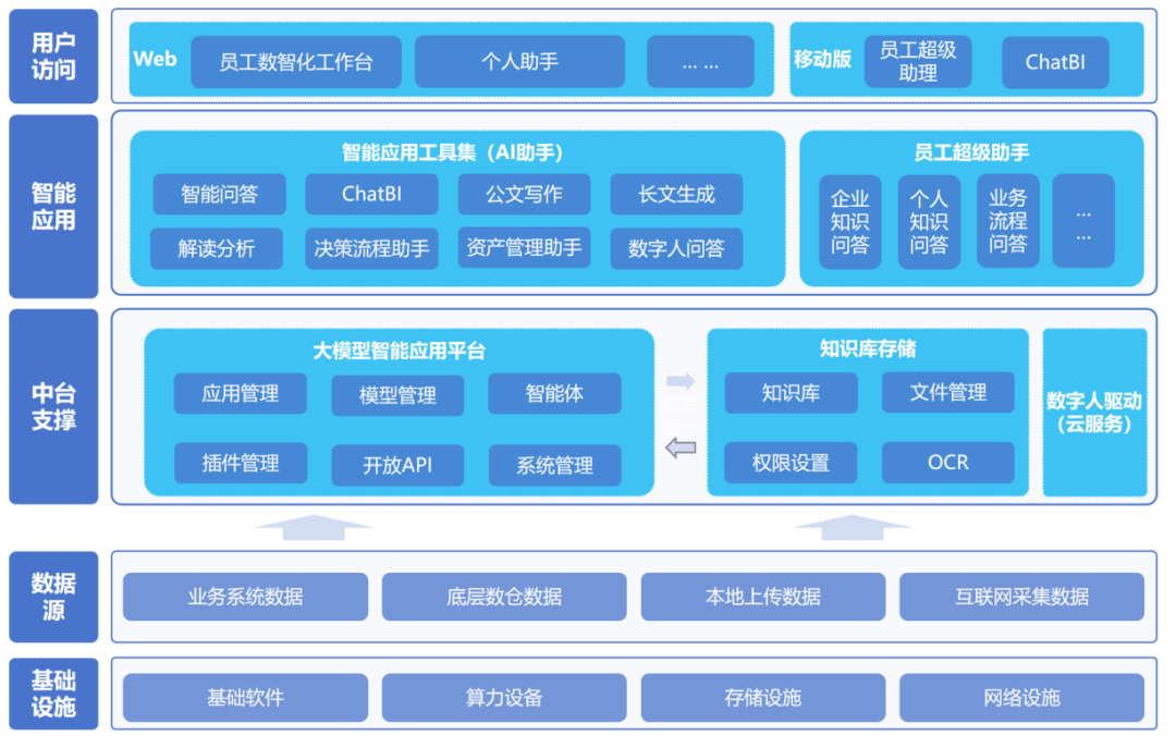 智能使用层:次要支撑智能化使用东西集(AI帮手)及员工超等帮手两大使用模块,确立以下计谋方针: